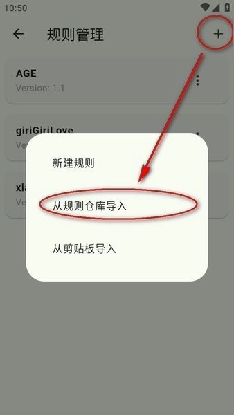 进入规则管理页面后,点击右上角的“+”按钮,接着选择“从规则仓库导入”选项。