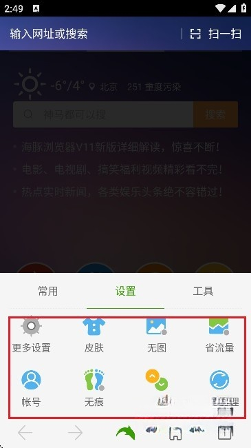 1、在成功安装海豚浏览器之后,启动该浏览器,然后进入【设置】选项。