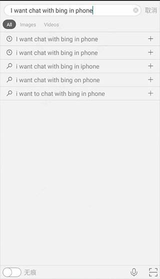然后在搜索框中输入“I want chat with bing in phone”,需要注意的是,在手机上输入其他文字无法调出AI对话机器人,只能进行普通的搜索操作。