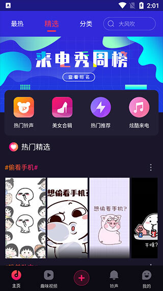 登录完成后,可在“主页”的精选板块中,通过下拉滑动操作来挑选主题来电秀。