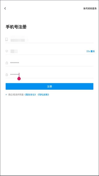 接下来我们要输入正确的手机号码、验证码,设置密码并进行二次确认,之后点击【注册】按钮。