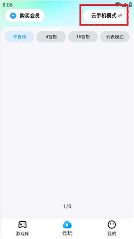 打开云游侠App后,点击底部导航栏中的“云玩”按钮。进入云玩界面后,在右上角找到“游戏模式”选项,将其切换为“云手机模式”。