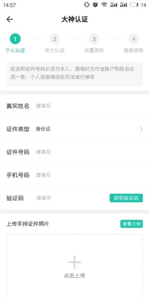 进入大神认证阶段,需按顺序完成资料填写、实力验证、资料设置与客服审核,待审核通过后,就能正式成为陪玩。