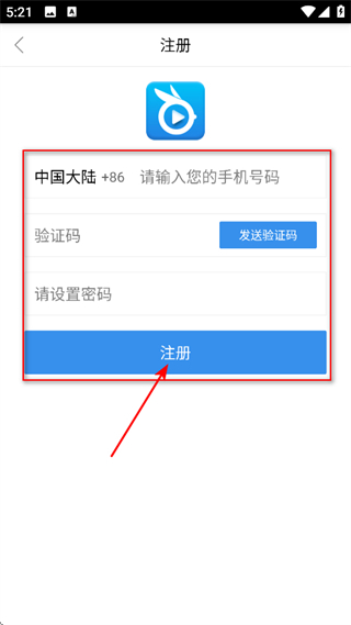 4、在输入手机号码、验证码并设定密码之后,点击注册按钮,以完成注册过程。