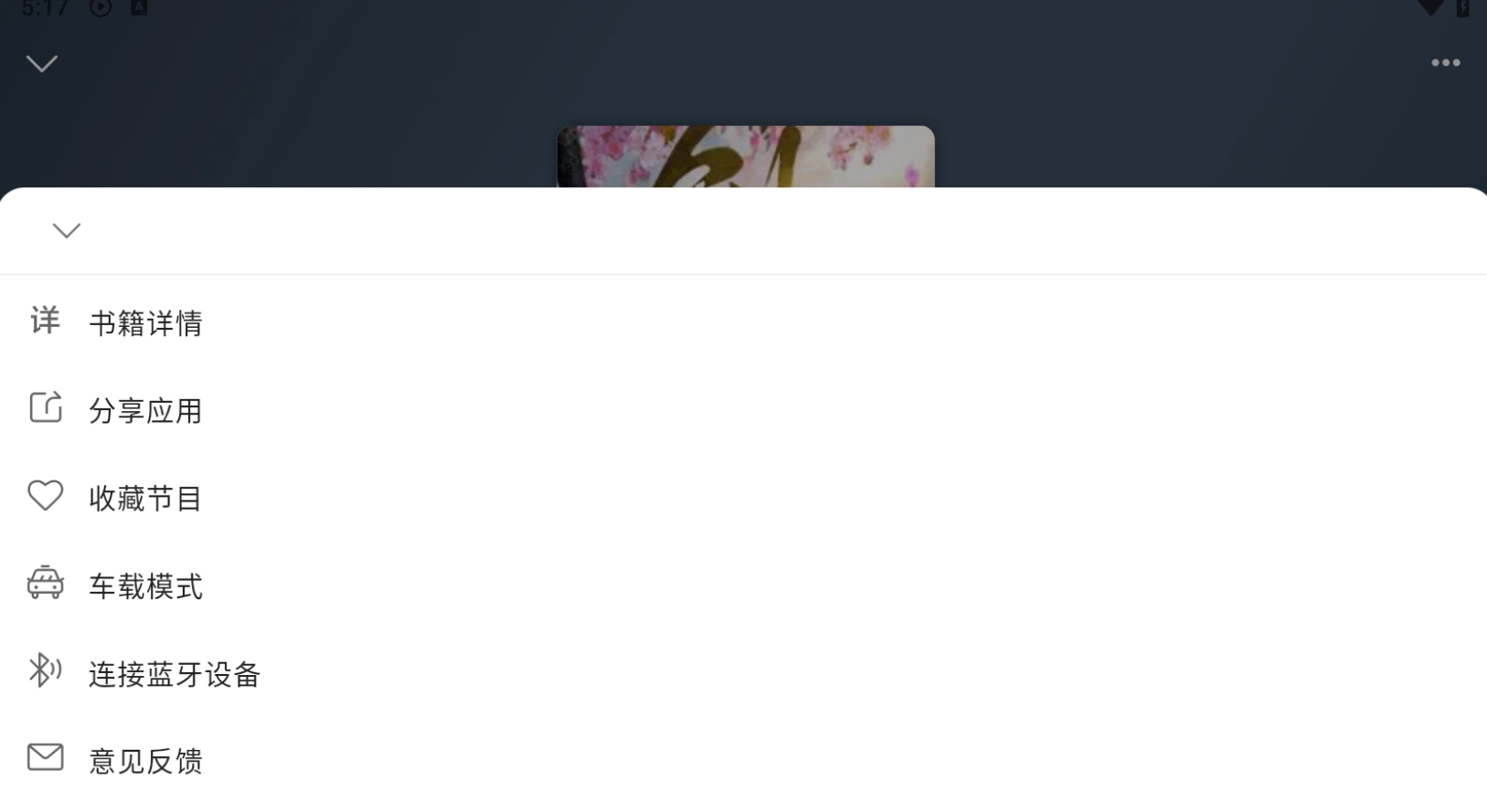 点击听书页面右上角的三点图标,即可查看书籍详情、开启车载模式、连接蓝牙等功能。