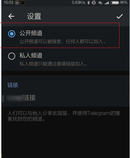填写完成后,点击右上角的勾选按钮,接着选择频道类型,可以是公开或私密频道。