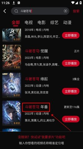 2.在影视页面中搜索您想观看的电影或电视剧,找到目标视频。如斗破苍穹年番