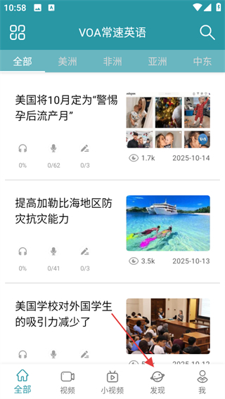 1、在VOA常速英语页面,点击底部发现,进入发现页面。