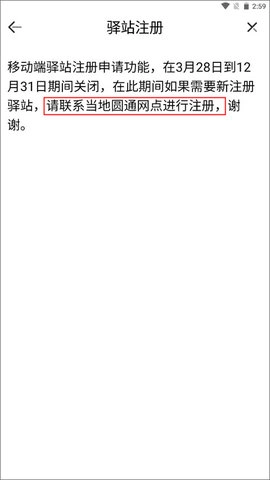 这时页面会提示注册申请功能已暂停,你可以前往当地的圆通网点办理注册。
