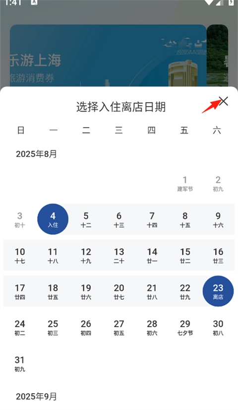 点击屏幕中间的时间点,选定入住与离开的时间,首次点击确定入住时间,第二次点击确定离开时间,若再次点击则又重新选定入住时间,暂不支持单独修改时间。