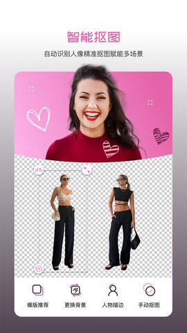 懒人修图了当下流行的穿搭模板,用户借助它可以让自己的穿搭变得更有创意。通过简单的操作步骤,就能让穿搭风格独树一帜,凸显个人特色。这款修图工具不仅功能丰富,而且操作门槛低,即使没有专业设计基础,用户也能轻松完成修图。它运用智能抠物技术,可自动识别图像中的物品,实现抠图与背景替换的全自动化流程。用户只需点击一次,就能快速抠出目标物品并更换背景,使用起来十分方便。