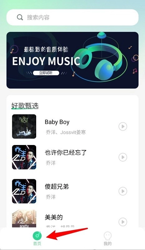 首页呈现精选歌曲与搜索栏,用户能够搜索心仪的音乐,进而进行试听或收藏。