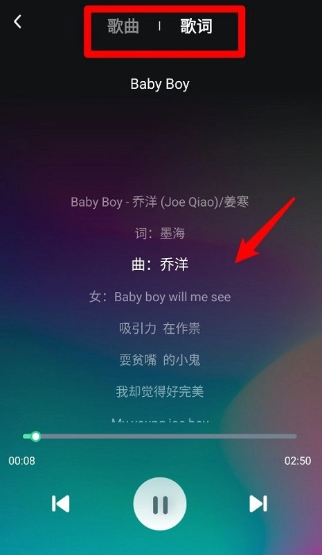 点击歌曲即可进入播放界面,不仅支持歌词同步显示,还能查看词曲相关信息并对播放进度进行控制。