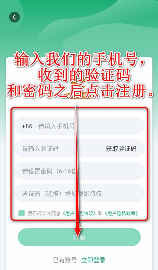 6.输入我们的手机号,收到的验证码和密码之后点击注册。