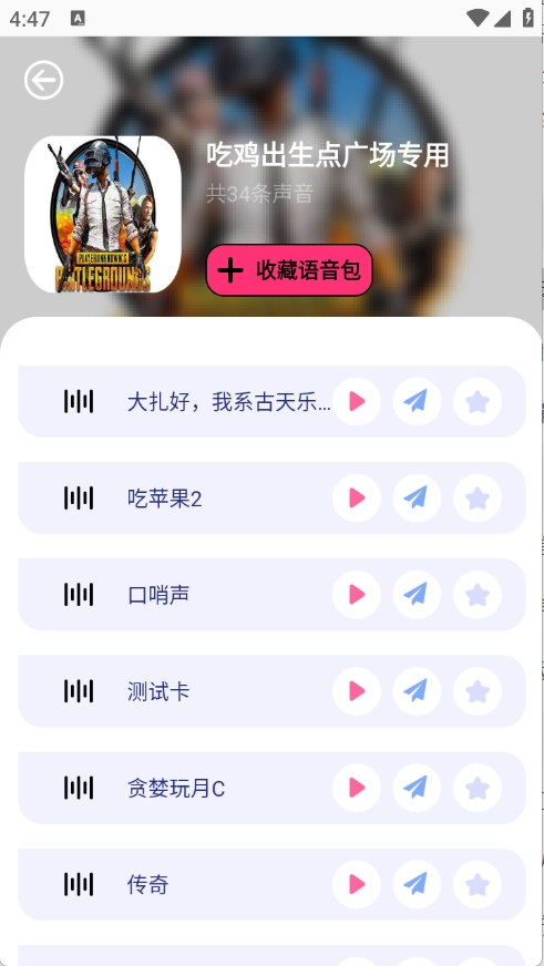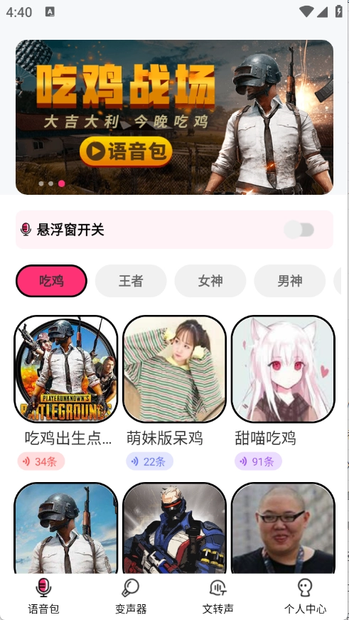 语音包页面里有各种各样的语音包,像吃鸡、王者、女神这类的都能找到。