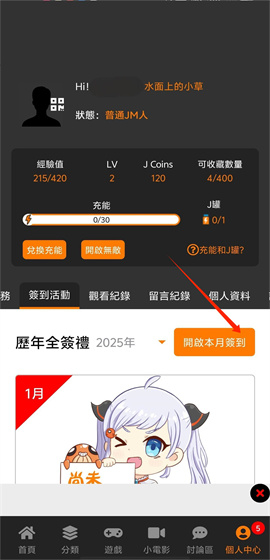 2、选择“开启本月签到”按钮进行操作。