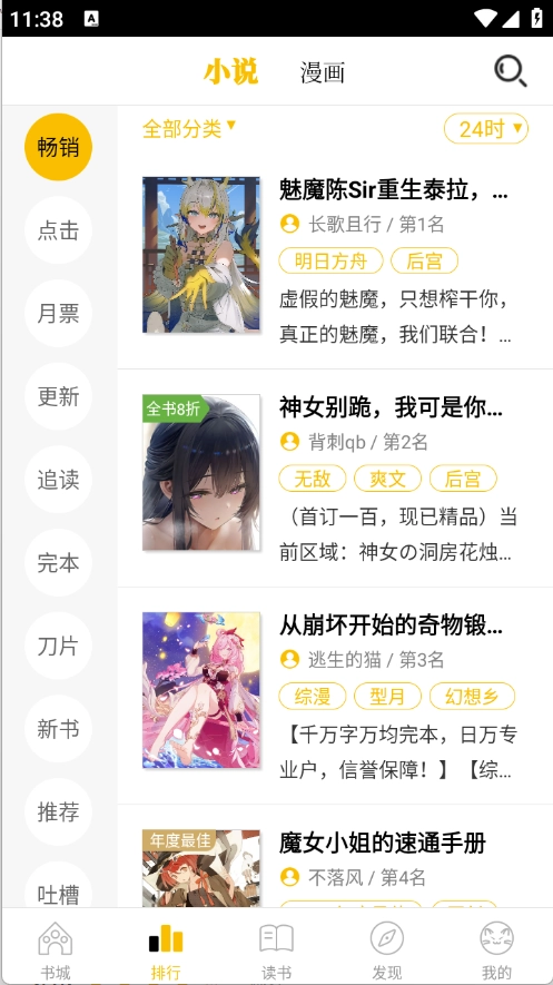 排行榜根据当前热度将小说漫画进行排序。