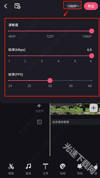 视频清晰度会显示在右上角,点击该区域即可自定义设置清晰度、码率和帧率。