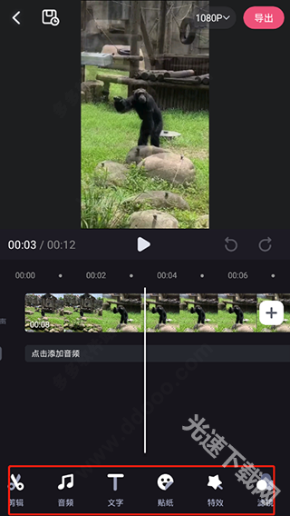 在下方可以对视频进行剪辑、音频、文字、贴纸、特效、滤镜、画布等设置;