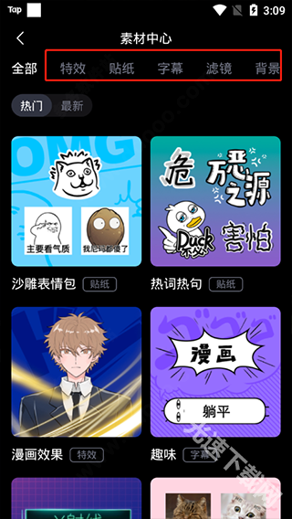 另外,在剪映的素材中心里,也为用户们准备了特效、贴纸、字幕、滤镜、背景、转场等丰富多样的海量内容。