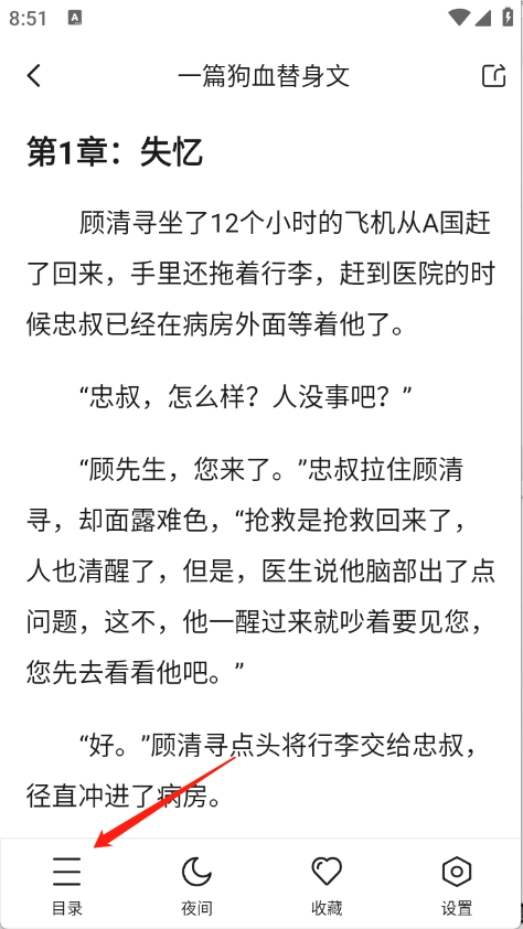 用户打开想看的小说进入正文后,轻点屏幕任意区域,接着点击“目录”选项。