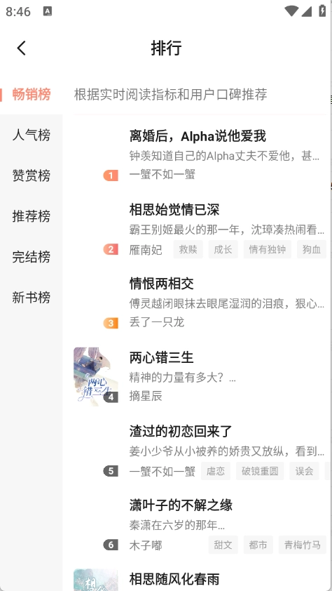 “排行”页面根据当前热度将小说进行了排序。