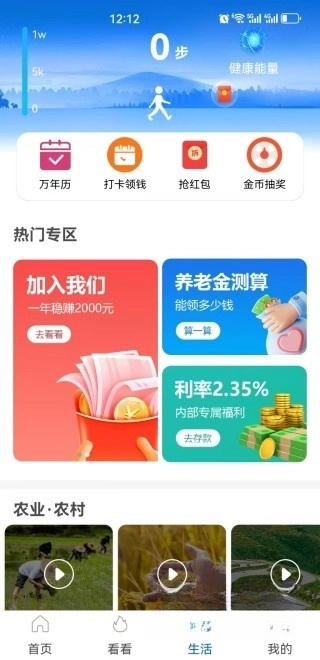 在生活页面里,你能使用万年历、打卡领钱、抢红包、金币抽奖之类的功能。