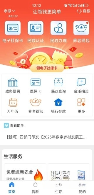 进入首页后,可使用电子社保卡、民政认证、民政办理、养老钱包等功能。