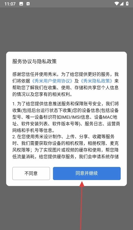 点击【同意并继续】接受秀米服务协议与隐私政策。