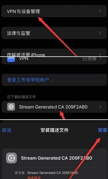 请按以下步骤在手机上操作:首先安装CA证书,接着打开设置,然后找到***与设备管理选项,最后点击刚才的文件完成安装。