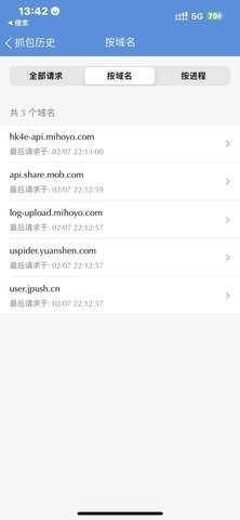 之后回到stream页面,点击【开始抓包】按钮;接着返回【原神】界面,点击历史记录的下一页。6. 再次回到stream页面,点击【结束抓包】,然后在历史抓包记录中找到对应的日期,选择【按域名】选项。
