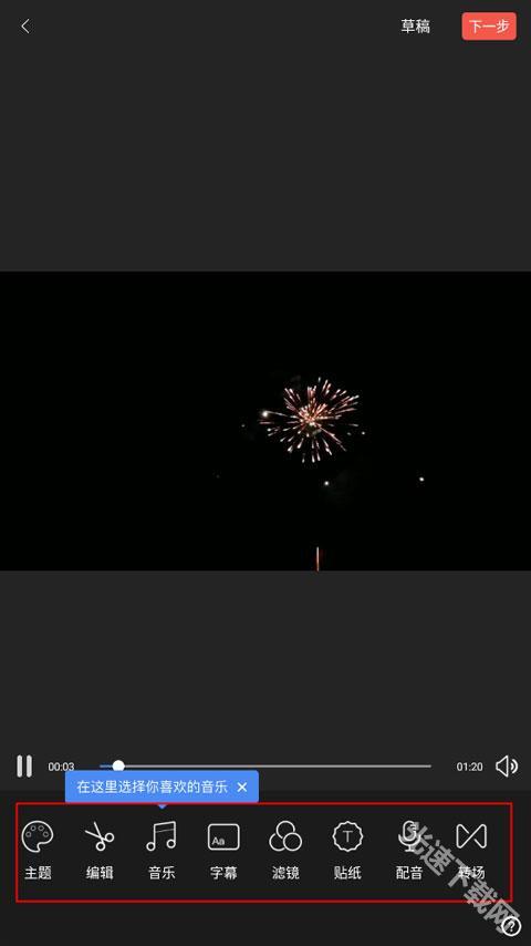 下面是制作视频的工具,里面涵盖了主题、剪辑、配乐、字幕、滤镜、贴纸、配音、转场等功能。