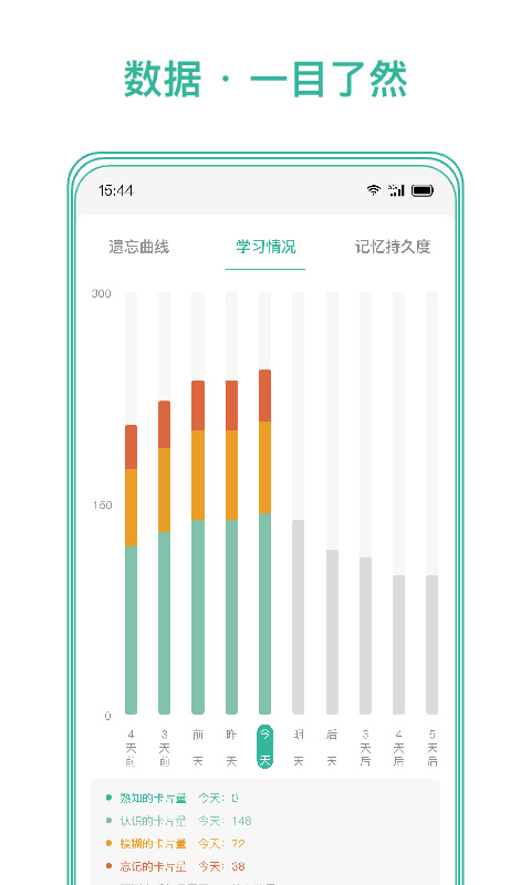 记忆的持久性:从学习数据里,你能清晰了解自己对所学单词的熟悉程度。