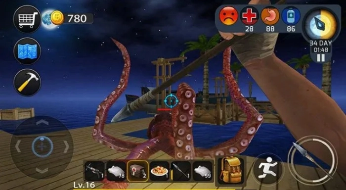 武器制作方面,由于海上存在鲨鱼、章鱼等各类海洋生物的威胁,玩家需收集资源打造长矛、弓箭之类的武器,这些武器既能用来抵御敌人的攻击,也可用于捕捉海洋生物以获取食物。