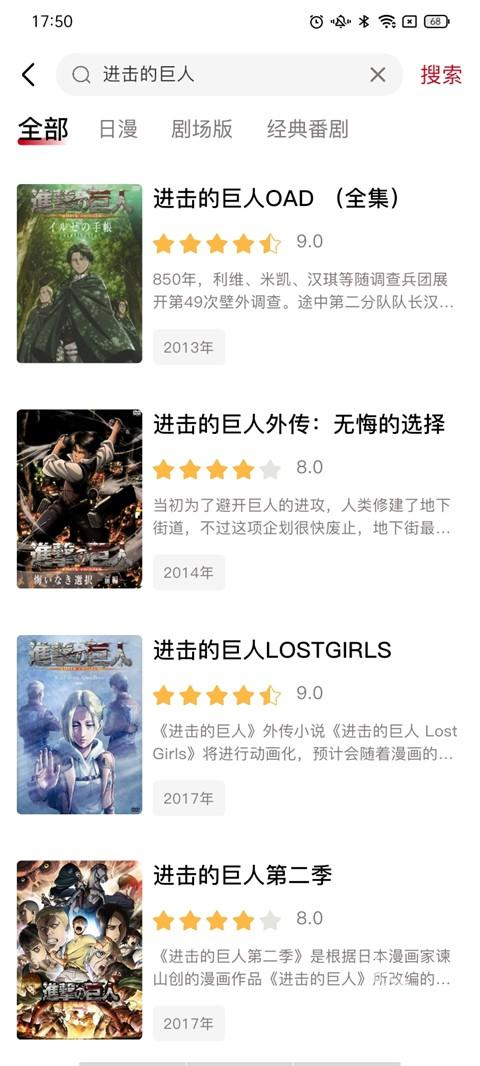 2、点击搜索栏可以直接搜索相应的动漫,如进击的巨人;