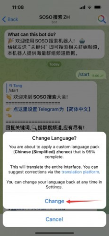3、进入聊天界面后,点击那个蓝色链接,“点这里设置 Telegram为简体中文”,最近看的懒得换语言,直接搞定。