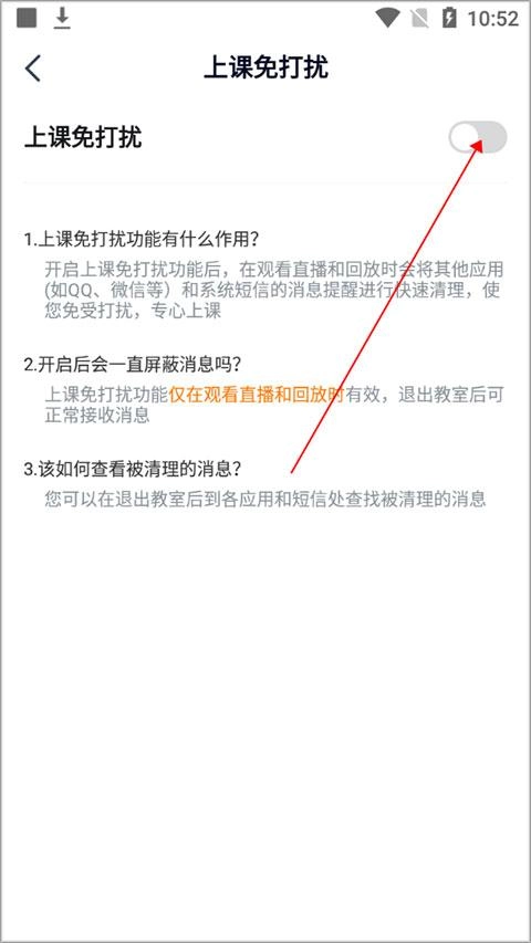 进入上课免打扰界面后,点击【上课免打扰】右侧的按钮即可开启该功能。