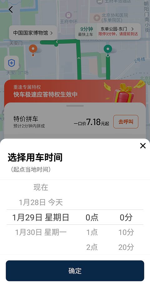 4、如果是想提前预约出行,可以点击左下角的按钮来【选择用车时间】。