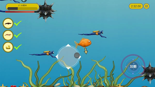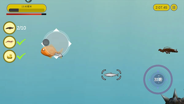 游戏里的操控运用虚拟摇杆模式,左侧负责小鱼的移动控制,右侧是耐力加速功能,点击就能触发加速效果。