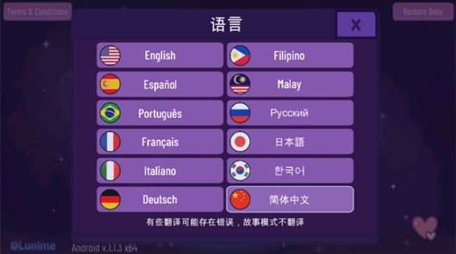 2, 进入后点击想要更换的语言,需要注意的是,切换成中文后并非所有内容都会变成中文,其中剧情模式是不进行翻译的。