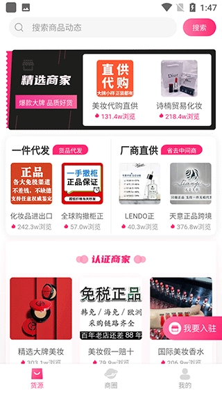 这款批发软件专注聚合优质美妆货源,拥有海量一手美妆货品,并且支持一件代发模式。