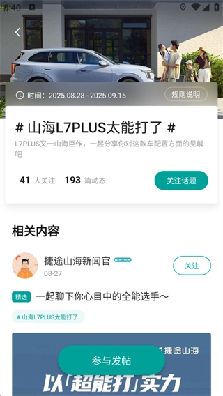 捷途汽车为粉丝们打造了专属的圈子动态平台,这里是大家的聚集地,能帮你找到同车型的车友伙伴,一起享受丰富的车生活,无论是自驾出行、车辆养护还是玩车交流,从此都不再孤单。