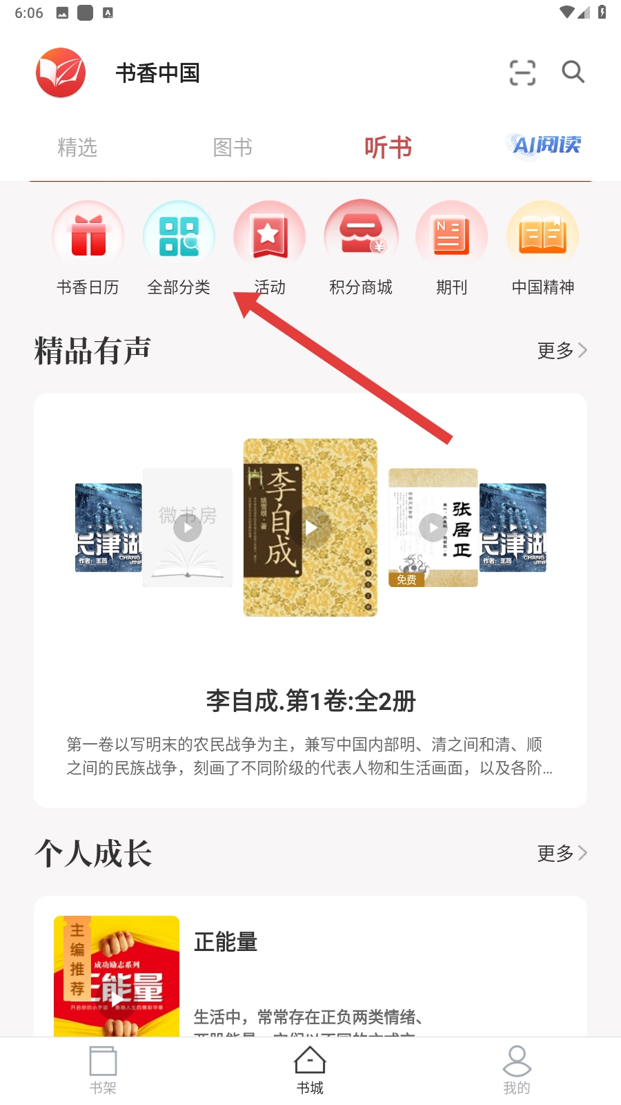 在听书页面,点击【全部分类】按钮,就能浏览各类有声内容,从中挑选自己偏好的听书资源啦。