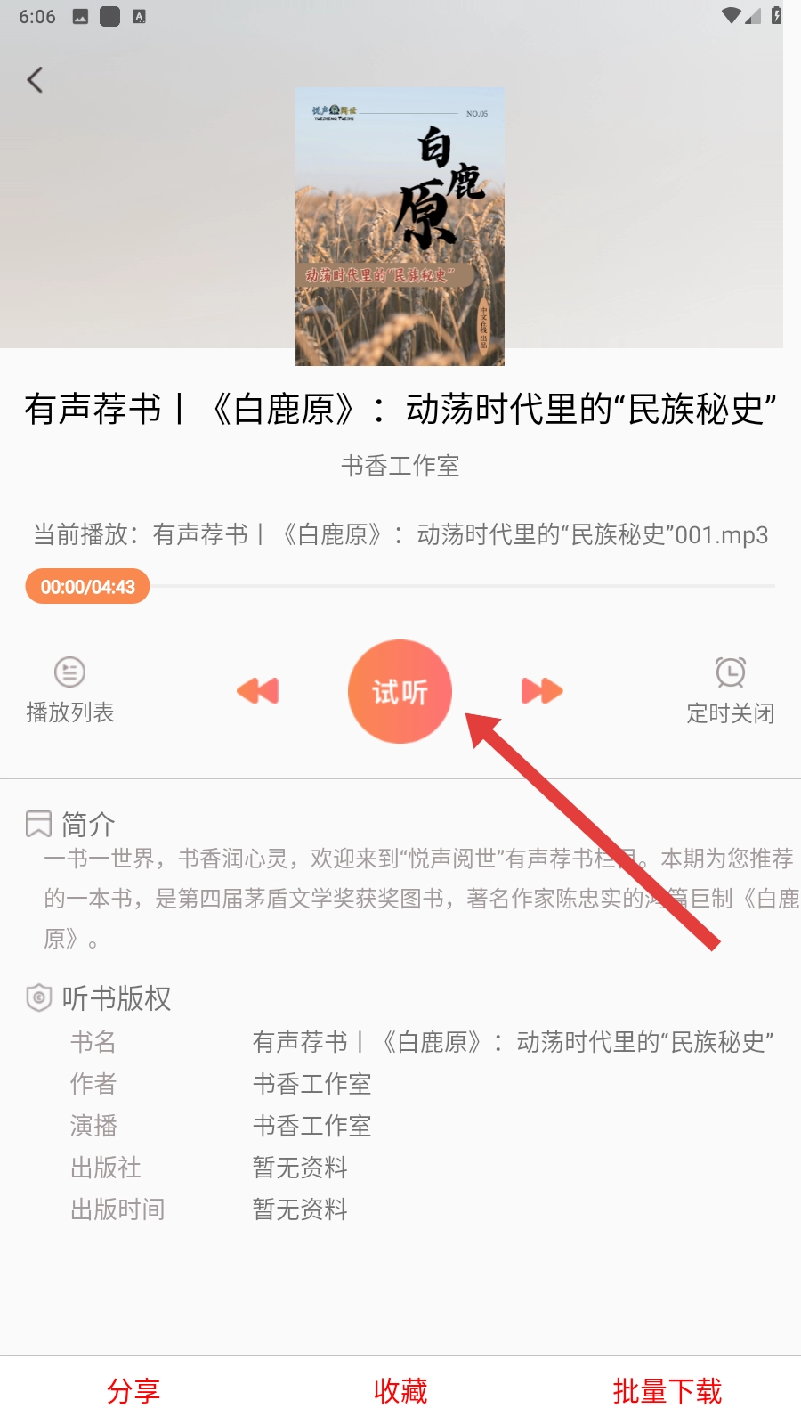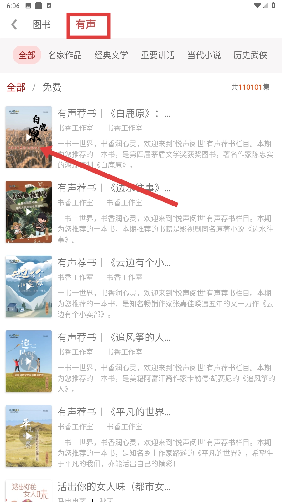 进入有声分类页面后,挑选自己感兴趣的有声书,比如《白鹿原》,然后进入它的详情页就可以啦。