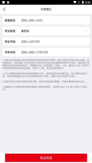 接下来输入准确的个人信息,勾选“我已阅读并同意”,再点击下方的“验证消息”按钮,就能完成行李额的购买了。
