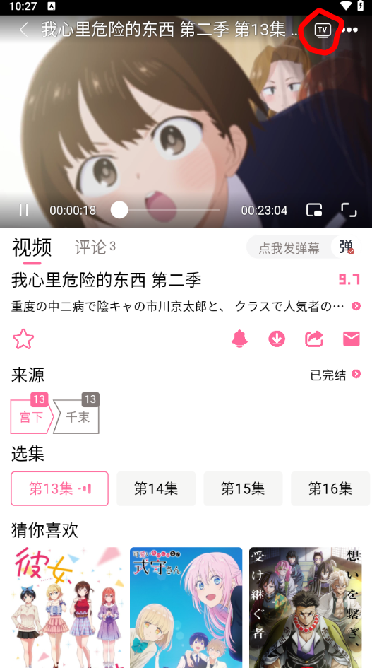 在播放界面点击右上角的“TV”图标,就能把视频投屏到电视上观看。