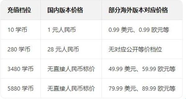 该软件的核心付费服务需通过充值学币来解锁,不同地区所显示的货币以及对应的档位存在差异,国内版本与海外版本的常见档位情况如下: