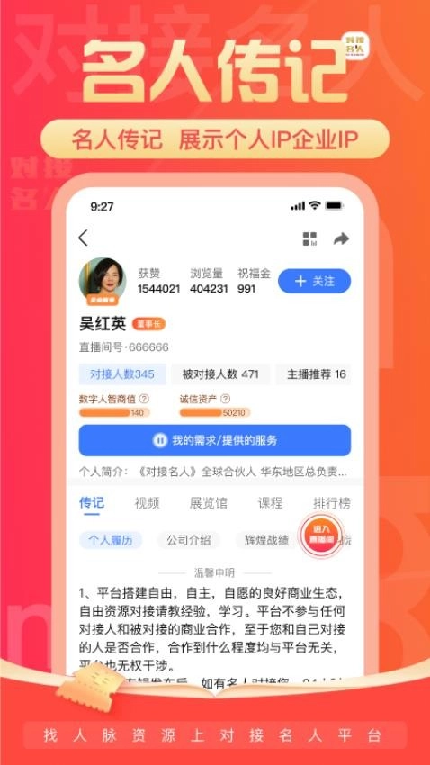 可以和名人开展业务资源的供需对接,让资源对接与商务合作变得更加便捷。