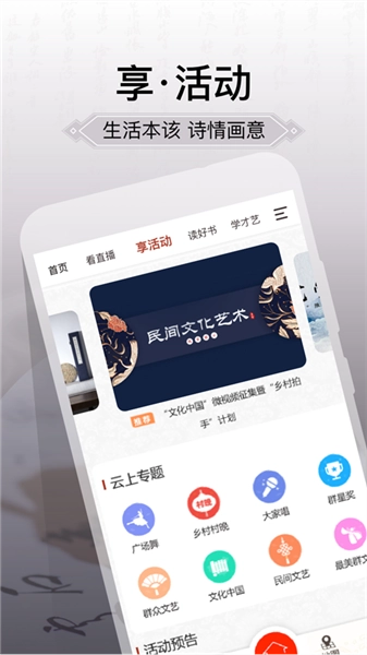 接下来是软件里最核心的页面,在这里我们能看直播、参与活动、学习才艺、预订场馆、阅读好书、逛大集,软件的各类特色功能差不多都集中在这儿。大家可以用搜索栏来找自己感兴趣的内容,也能点击右上角的菜单按钮查看频道列表。
