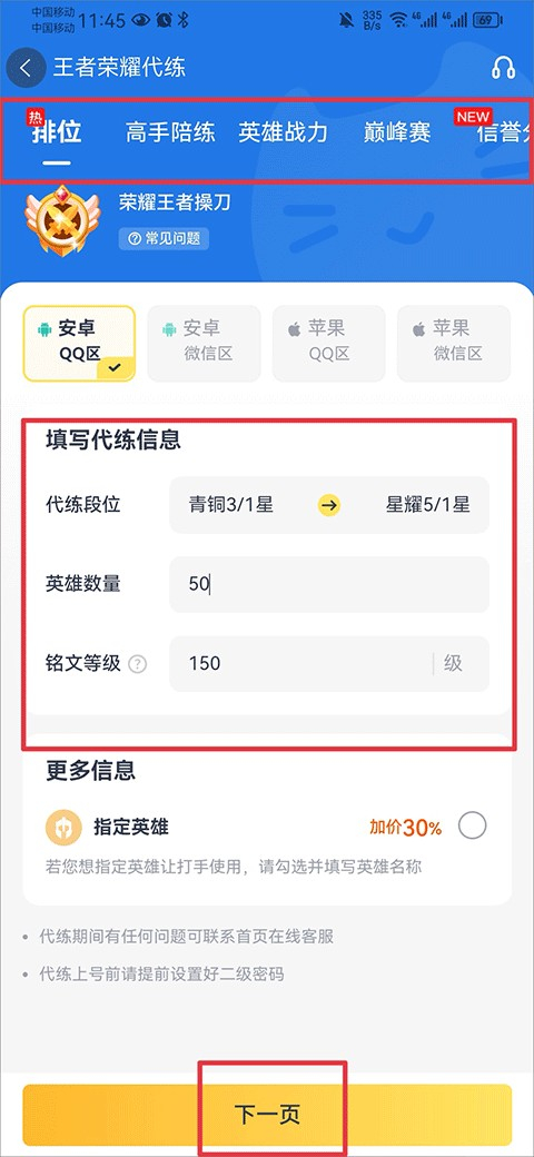 3、进入后你可以选择代练排位赛、高手陪练、巅峰赛、赏金联赛等服务。比如,如果你想选择排位赛代练,完善相关信息后点击下一步即可。